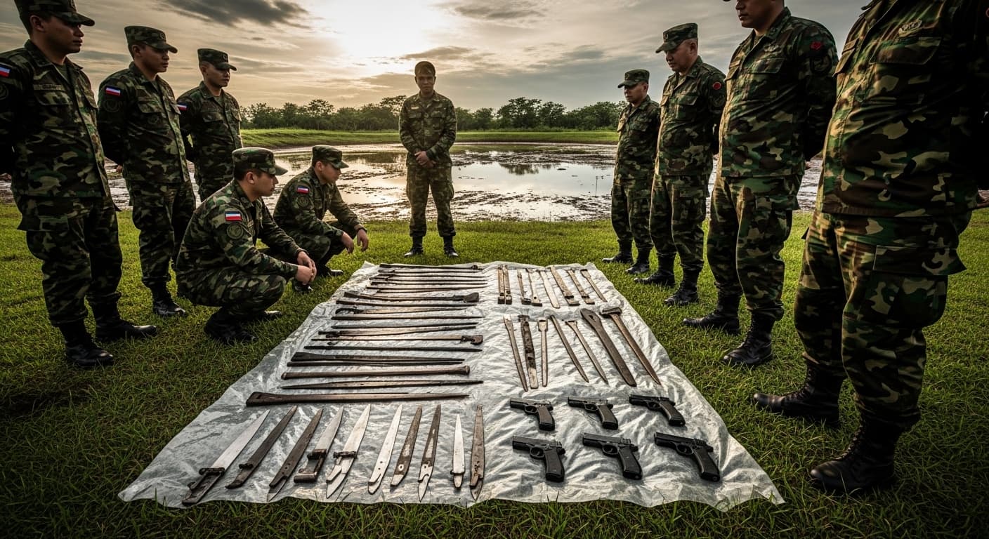 ফরিদপুরের কানাইপুর ইক্ষু ক্রয় কেন্দ্র এলাকায় একটি পুকুরের তলদেশ থেকে বিপুল পরিমাণ দেশীয় ধারালো অস্ত্র এবং আগ্নেয়াস্ত্র উদ্ধার করেছে বাংলাদেশ সেনাবাহিনীর নেতৃত্বাধীন যৌথবাহিনী। শনিবার দুপুর ১টা থেকে বিকেল ৫টা পর্যন্ত পরিচালিত এক বিশেষ অভিযানে এসব অস্ত্র জব্দ করা হয়।