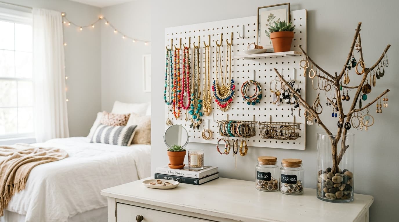 হার্ডওয়্যারের দোকানে খুব কম দামে পেগবোর্ড পাওয়া যায়। এটি দেয়ালে বসিয়ে ছোট ছোট হুক ব্যবহার করে মালা, ব্রেসলেট এবং দুল ঝুলিয়ে রাখতে পারেন। এতে সব গয়না এক নজরে দেখা যায় এবং সেগুলো জট পাকিয়ে যাওয়ার ভয় থাকে না।