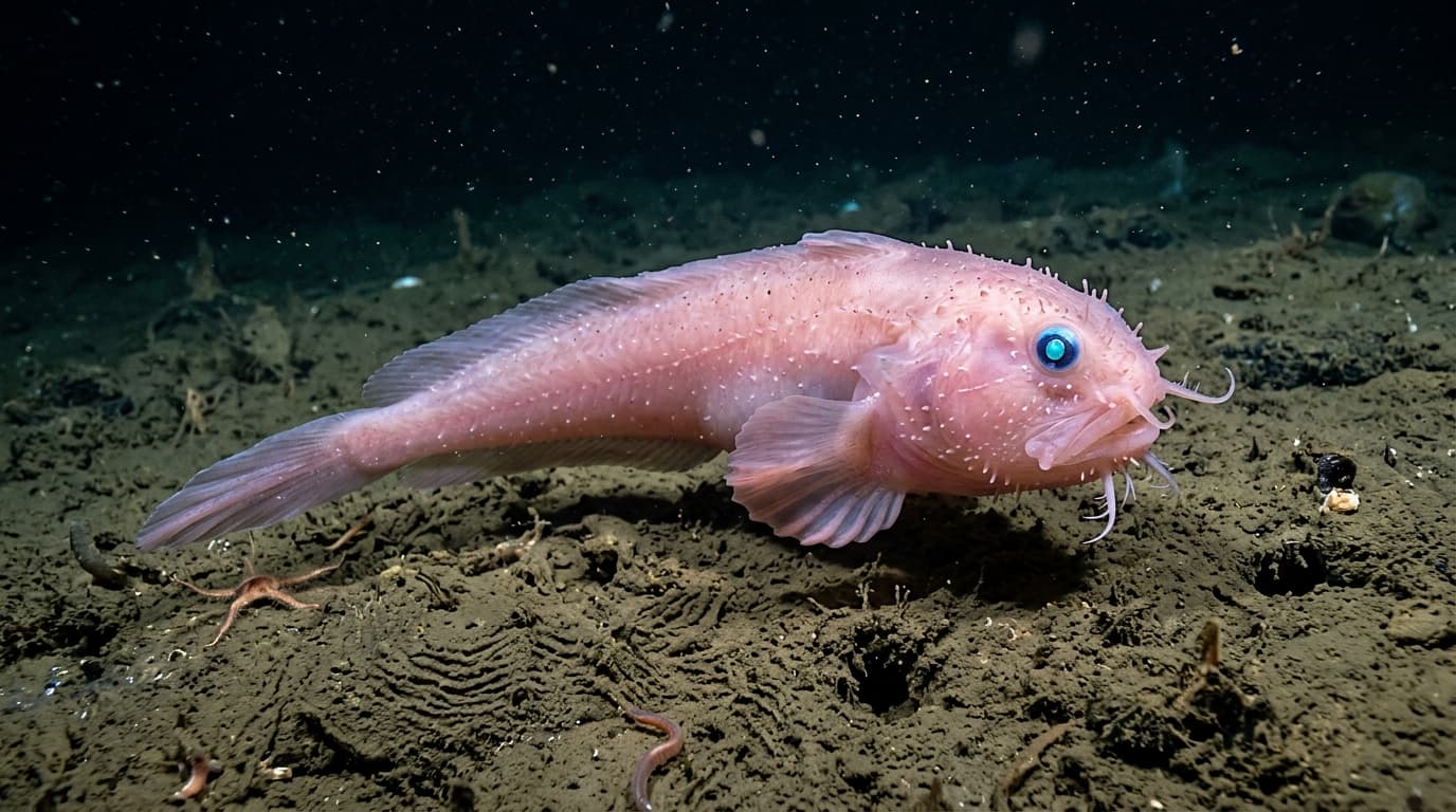 Careproctus colliculiগোলাপী দেহ, নীল চোখ, এবং ছোট গোঁফের মতো উপাঙ্গ।১০,৭০০ ফুট