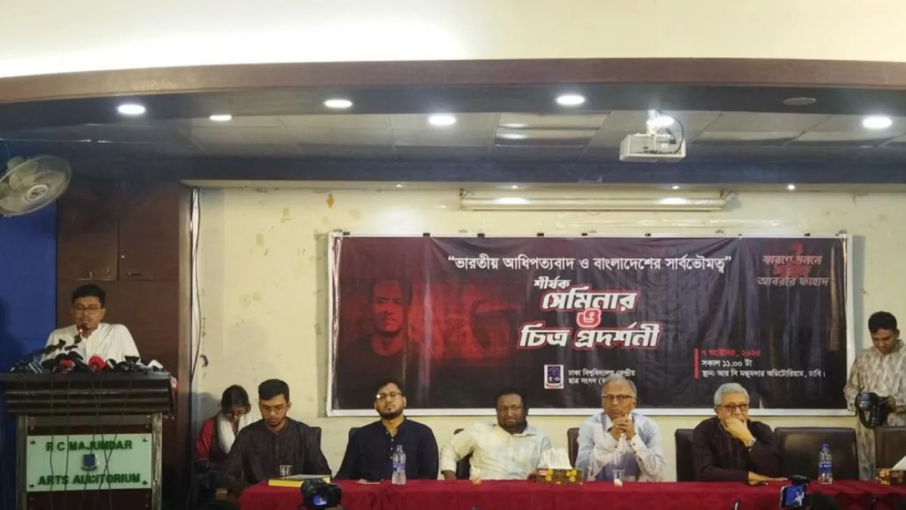 ঢাকা বিশ্ববিদ্যালয় কেন্দ্রীয় ছাত্র সংসদ (ডাকসু) মঙ্গলবার আরসি মজুমদার অডিটরিয়ামে “ভারতীয় আধিপত্য ও বাংলাদেশের সার্বভৌমত্ব: শহীদ আবরার ফাহাদকে স্মরণ” শীর্ষক সেমিনারের আয়োজন করে।
