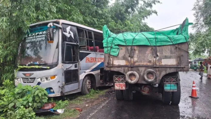 পাবনার সাঁথিয়া উপজেলার পূর্ব বংগ্রাম এলাকায় শুক্রবার ভোরে একটি যাত্রীবাহী বাস ও পাথরবোঝাই ট্রাকের মুখোমুখি সংঘর্ষে তিনজন নিহত ও অন্তত ১০ জন আহত হয়েছেন।
