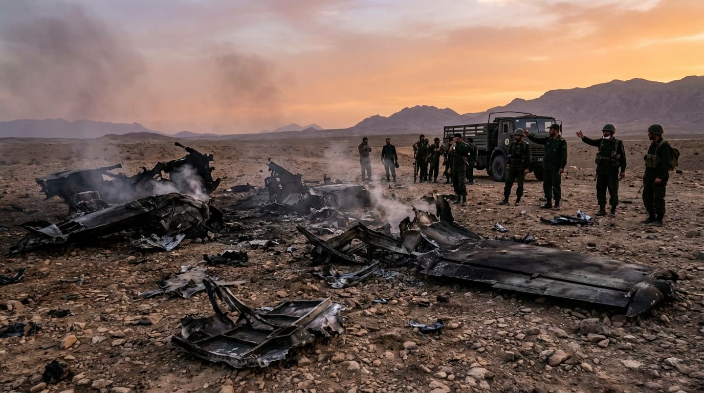 [Image showing charred wreckage of an American aircraft scattered in an Iranian desert]